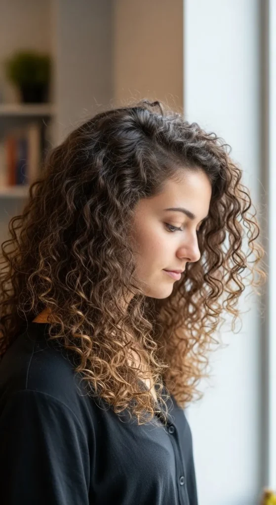 Classic long layers never go out of style. They suit all ages and lifestyles. The layers help curls fall in soft sections instead of one heavy block. This makes hair easier to wash, dry, and style. Ask for blended layers from top to bottom. Detangle only when wet with conditioner. Use simple oil on ends twice a week. Protect hair at night with a scarf and refresh with water spray. This style works for work, events, and casual days.