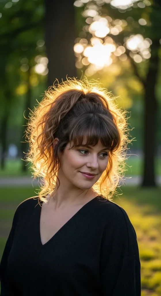 This cut looks good when tied up. Layers prevent flat ponytails and keep curls visible. Leave face pieces out and use soft scrunchies. It is perfect for daily wear.