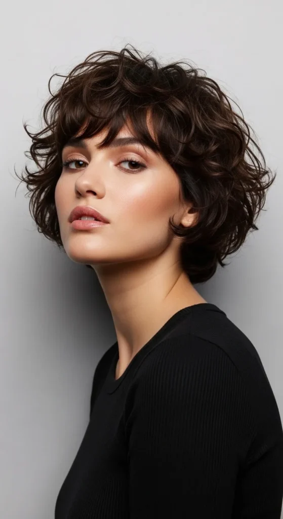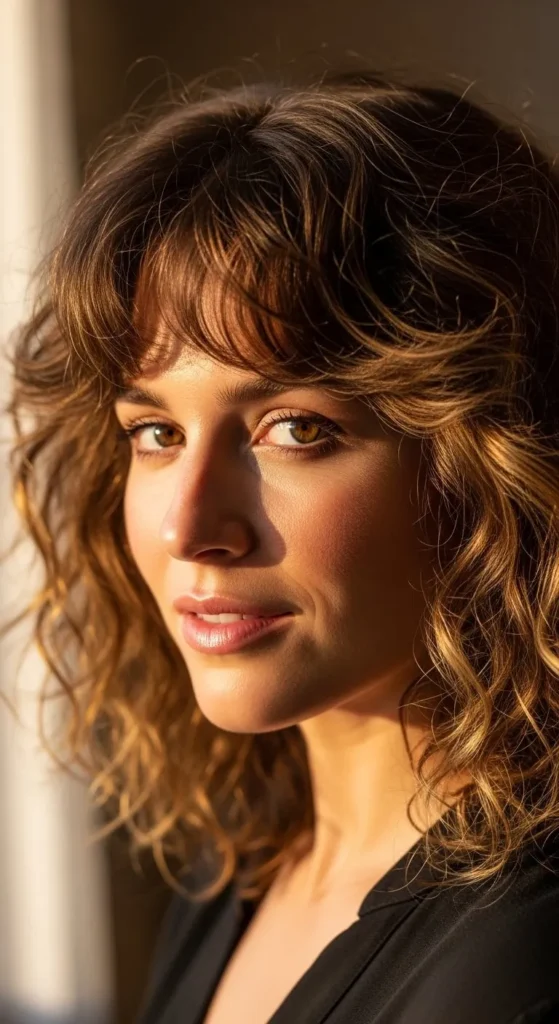 The curly shag has playful layers and relaxed volume. It suits people who like casual styles. Short layers on top create lift, while longer ends keep balance. Use sea salt spray or homemade salt water spray for texture. Scrunch and air-dry. Trim fringe carefully and cut tiny amounts only. This haircut feels youthful and hides uneven growth.