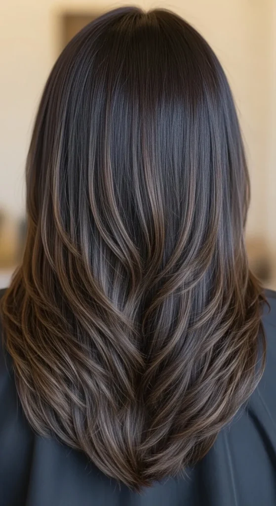 The V-cut adds shape and flow to long hair. Layers remove bulk while keeping length. Styling is easy: blow-dry straight or add curls for body. Use a wide-tooth comb to prevent frizz. DIY maintenance can focus on ends to retain the V-shape. This style looks natural and elegant without daily salon work.