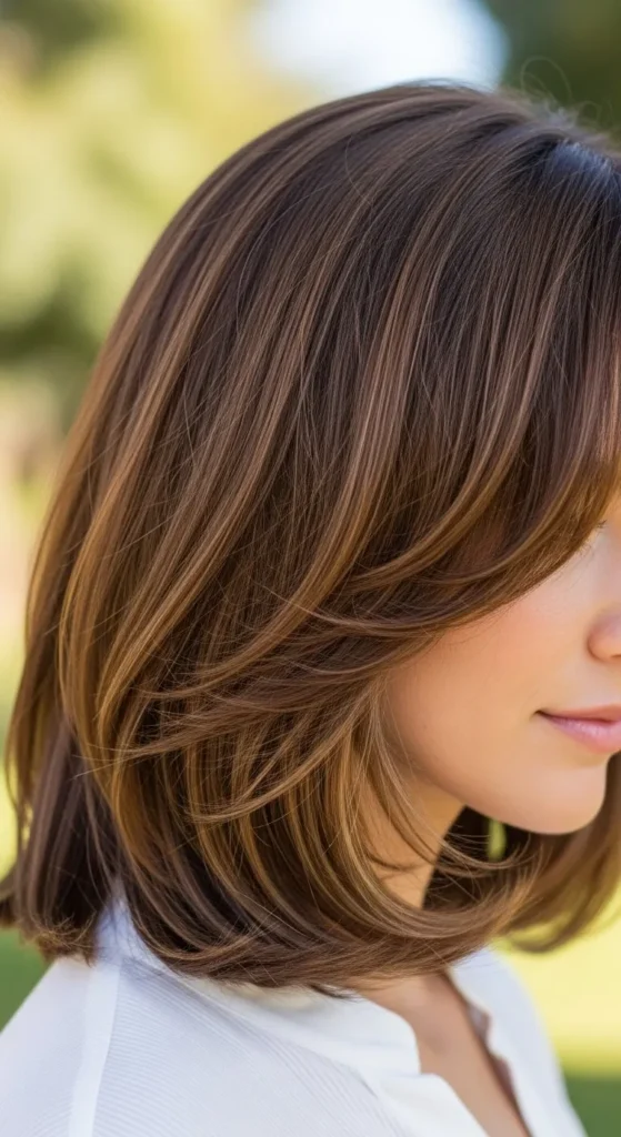 Shoulder-length layers give body without losing length. Easy to style and manage daily. Blow-dry for smooth finish or use curling iron for gentle waves. DIY trims maintain layer shape and prevent split ends. This cut suits most hair types, offering a polished yet effortless style perfect for work or casual outings.