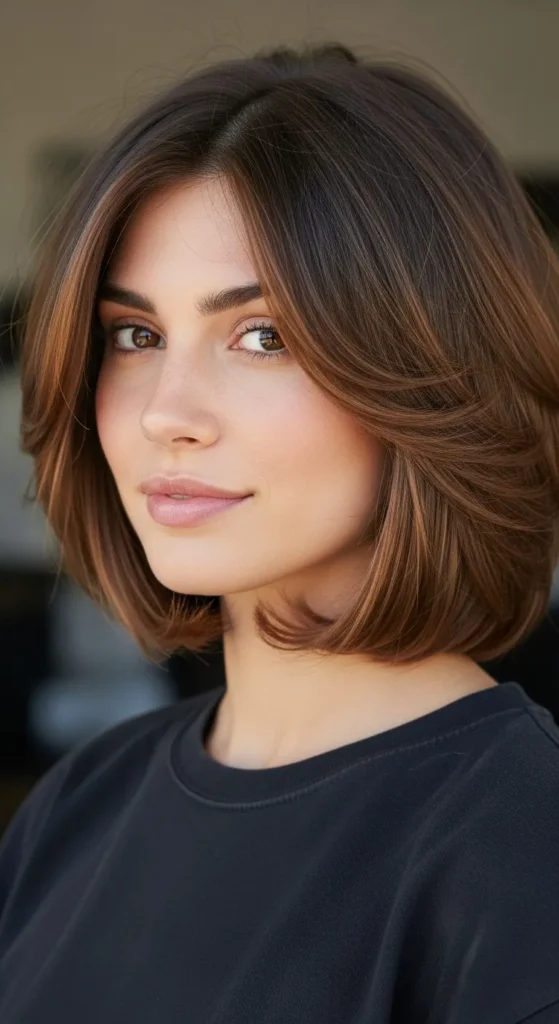 Curtain layers in a bob frame the face beautifully and add soft volume. Ideal for medium hair, this style is versatile and easy to style. Blow-dry with a round brush or flat iron for sleek finish. DIY trims keep layers even and maintain soft framing effect. A stylish cut that feels light and modern.