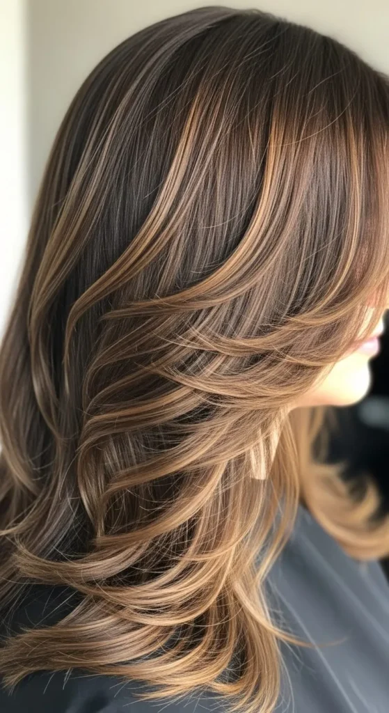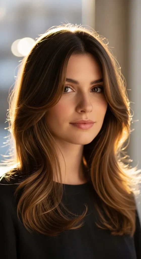 Long layered cuts with face-framing sections enhance natural volume and texture. Style with round brush or curling wand. DIY trims focus on front sections to maintain soft frame. Works for straight, wavy, or curly hair, giving a youthful, lively appearance. Layers reduce heaviness while keeping hair long.