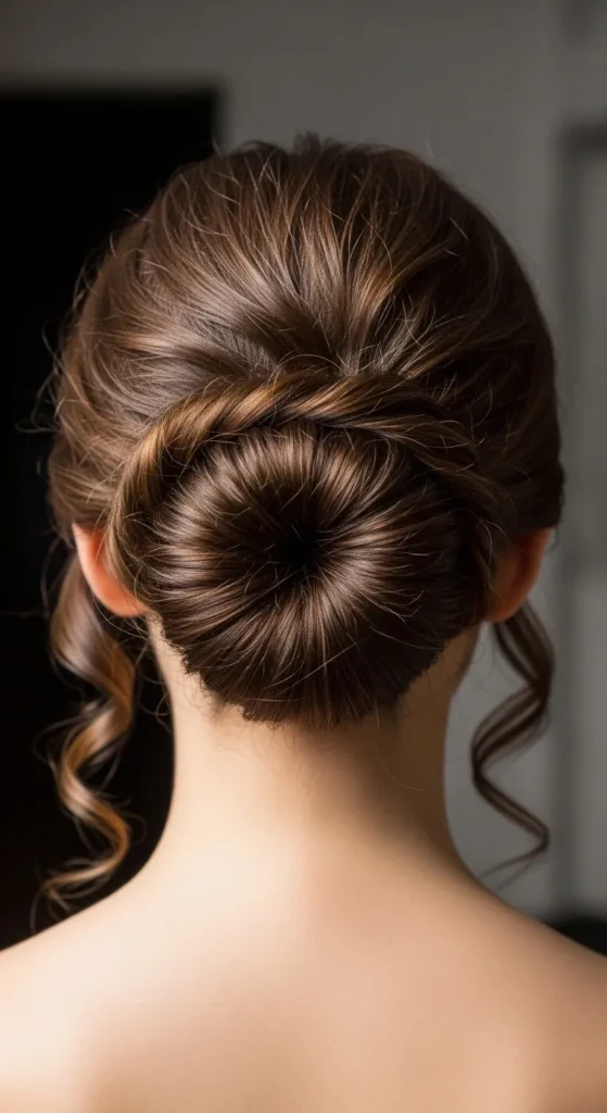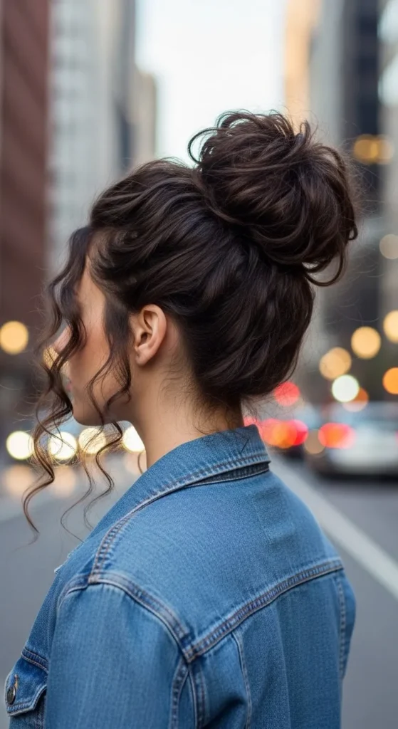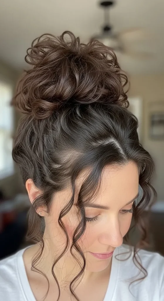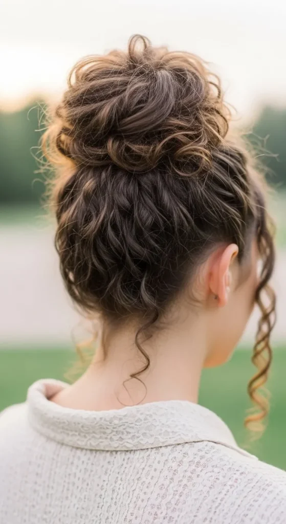 A messy bun with curly tendrils is casual yet stylish. Gather hair loosely, secure with pins, and let some curls escape. Budget-friendly hack: Use a rolled sock for volume.