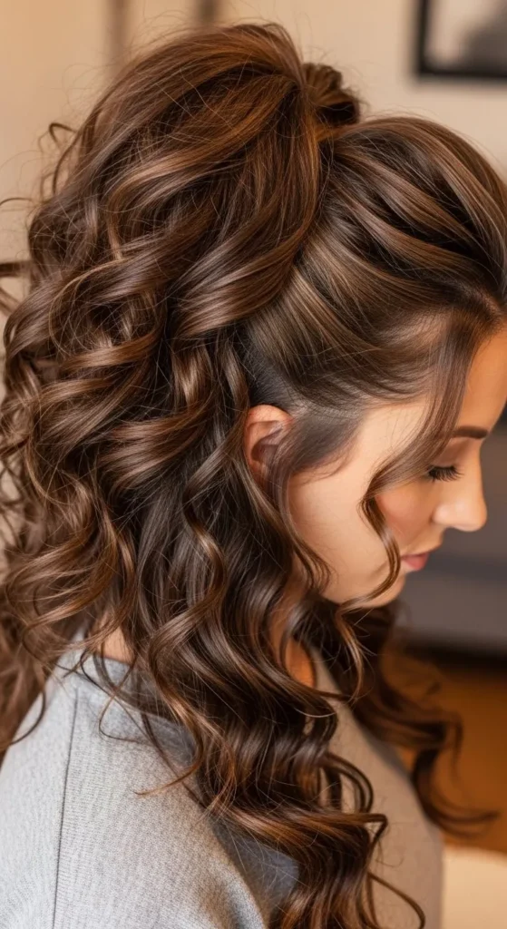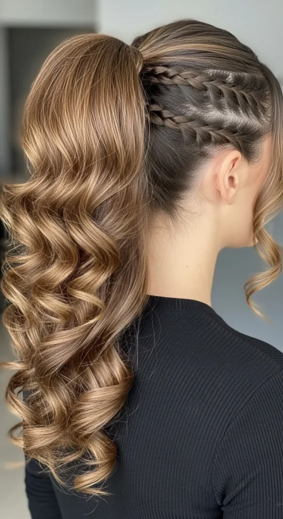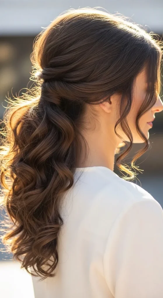 A low ponytail with voluminous curls is easy to achieve. Gather hair at the nape, lift roots slightly, and tie loosely. DIY tip: Twist a small section of hair around the ponytail base to hide the hair tie.