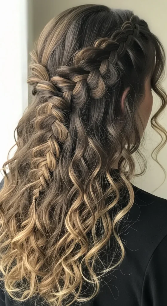 A waterfall braid lets curls shine while keeping hair controlled. Braid along one side, dropping strands to create cascading curls. DIY tip: Use small craft-store elastics to save money.