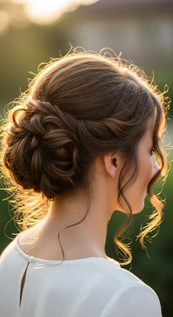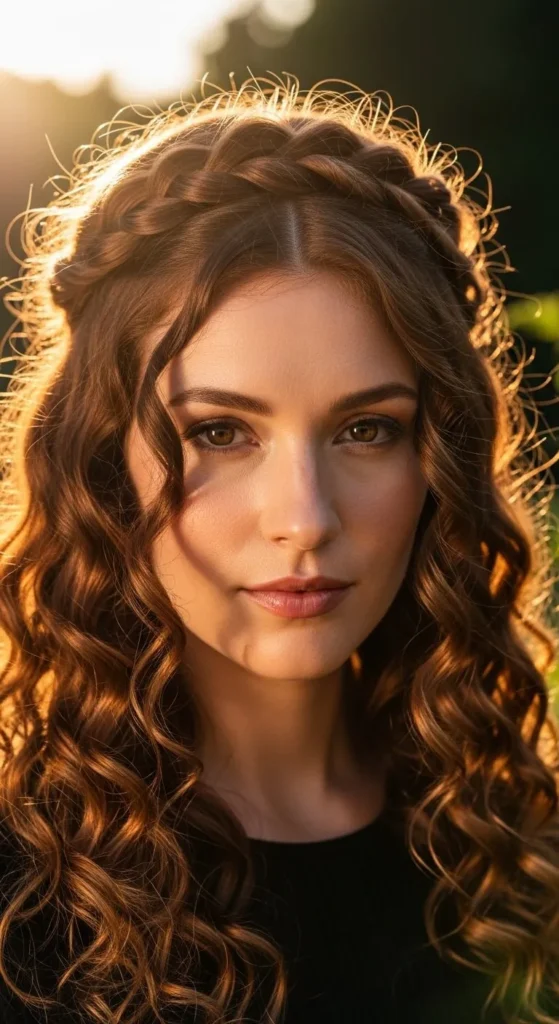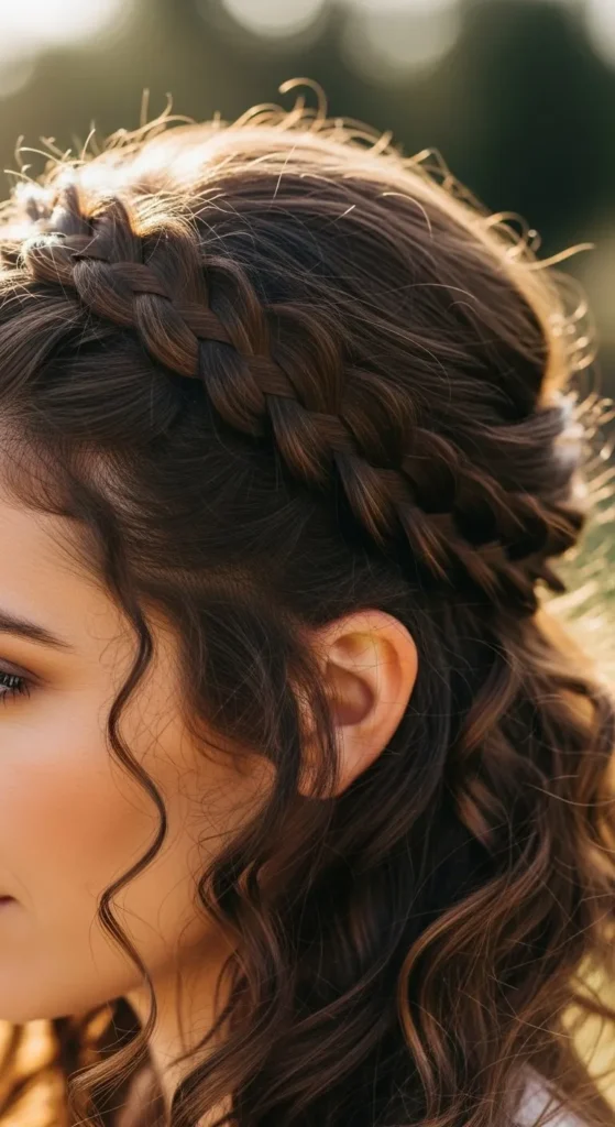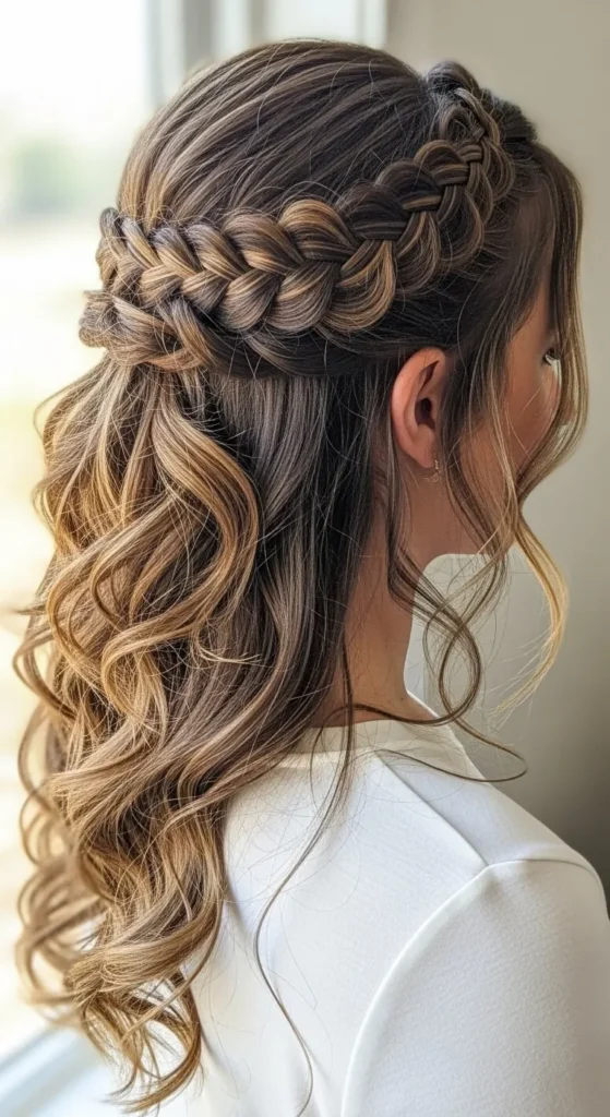 A curly braided crown is romantic and feminine. Take a section from one side, braid it loosely along the hairline, and pin across the head. DIY tip: Pull gently on the braid for a fuller look without professional help. This style works for weddings, parties, or casual outings.