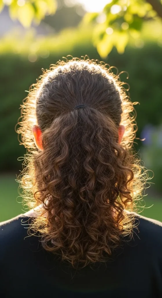 A curly ponytail with face-framing strands is effortless yet chic. Gather hair into a ponytail at mid-height, leaving a few front curls loose. Use a lightweight serum for shine and frizz control. DIY tip: Wrap a small curl around the hair tie to hide it and give a polished finish. This style is quick, ideal for busy mornings, and keeps your curls intact.