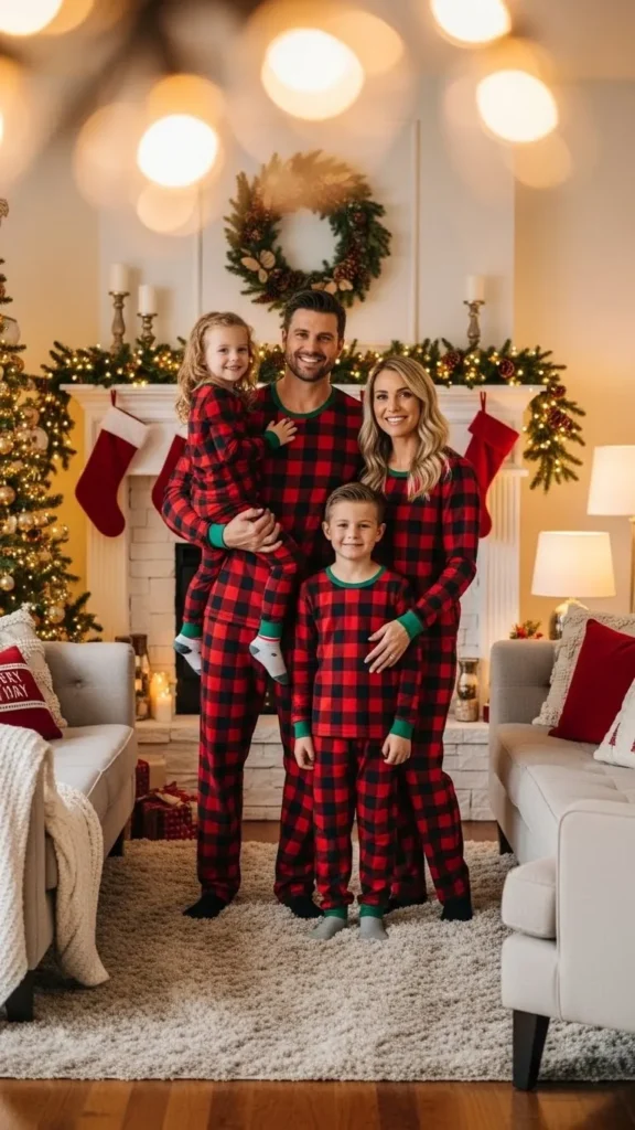 Red plaid pajamas bring instant holiday comfort. The pattern works for every age, and you can mix long sleeves, short sleeves, or button-ups. Keep the look relaxed by choosing cotton or flannel. If you want to save money, check local markets or reuse last year’s sets and size up for kids. Add fuzzy socks in similar shades for a neat touch. A simple DIY—wrap thin ribbon around the wrists as “mini cuffs” for photos. It looks cute and costs almost nothing. Keep your background soft with fairy lights or a plain wall. You don’t need fancy props. Just sit close, hug tight, or hold mugs. These outfits also work outdoors near trees or on a patio. The warm pattern helps the photo feel seasonal even with minimal décor. If one person doesn’t like full plaid, pair a solid red top with plaid bottoms to stay connected to the theme.