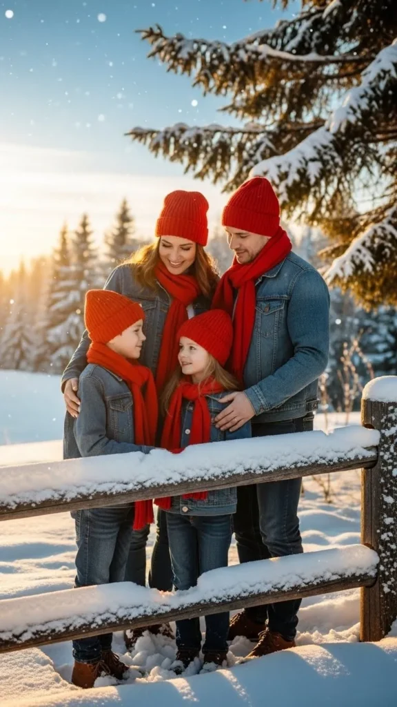 Denim keeps things casual while red accents bring holiday charm. Use jeans, jackets, or chambray shirts. Add red hats, scarves, or mittens to unify the photo. You can keep costs low by buying one red scarf and cutting it into smaller strips for hair ties or wrist ties. Denim looks good in nearly every setting—porches, parks, or indoor spaces. Keep your poses relaxed, like leaning on each other or holding hands. This style is simple, cozy, and easy to pull off with existing wardrobes.
