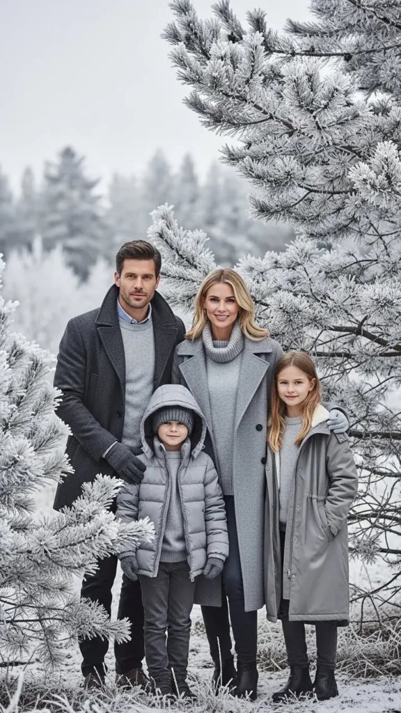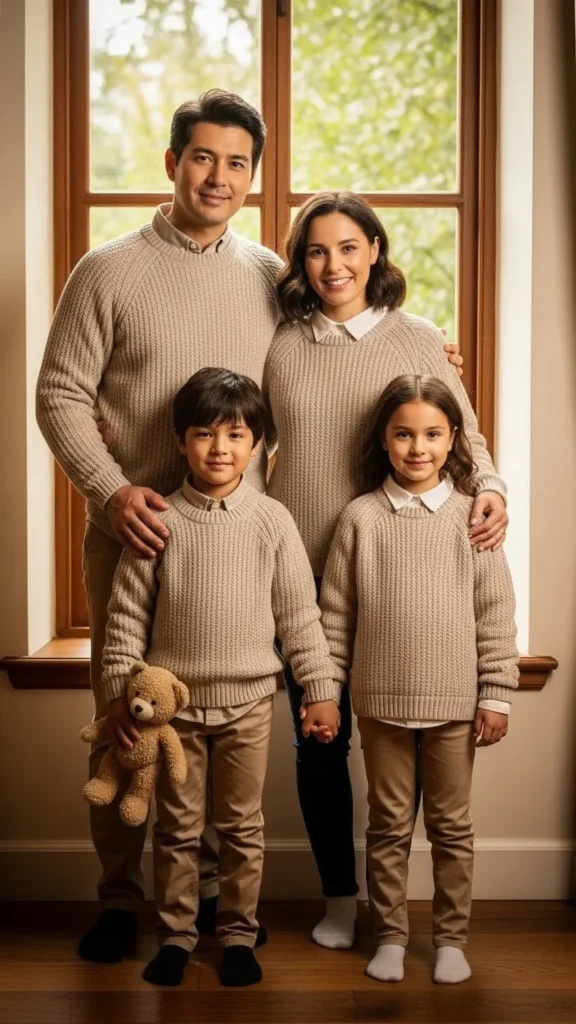 Beige creates a calm and timeless look. Layers help add texture—mix cardigans, sweaters, vests, and soft scarves. The shade is easy to match without buying new pieces. Many families already have beige clothing in their closets. If you want extra unity, add matching socks or neutral beanies. Take photos near soft natural light to make the tones look even warmer. You can craft tiny beige felt stars and pin them onto sleeves for a gentle holiday touch. Pose on a sofa or near neutral décor for best results.