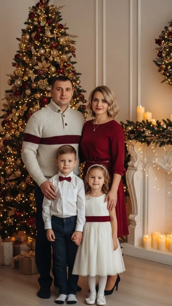 Burgundy and cream create a warm winter vibe. Combine cream sweaters with burgundy skirts, pants, or shirts. These colors work well indoors and add a gentle softness to photos. If you want to save money, choose just one burgundy piece per person and fill the rest with cream basics you already own. Add matching cream beanies or small burgundy bows. A simple DIY idea is to glue small pom-poms to hair clips for a festive touch. Keep lighting soft for the best effect.