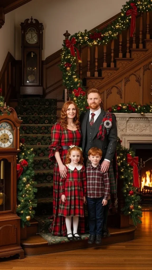 Tartan patterns feel very seasonal. You can mix different tartan colors, as long as everyone has some red or green. Dresses, skirts, button-ups, or scarves all work. Thrift stores often have tartan pieces at low prices. If patterns feel too strong, add solid cardigans to soften things. A small DIY idea—create tartan ribbon bracelets so everyone matches without needing full outfits. Take photos near staircases, trees, or doorways for a cozy backdrop.