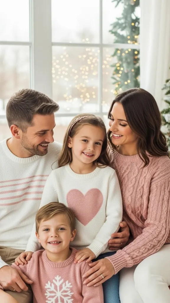 Blush pink adds a gentle, sweet touch to holiday photos. Pair pink sweaters with white jeans or dresses. This palette works beautifully for families who prefer softer tones. Add simple accessories like white hair clips or pink scarves. To stay budget-friendly, dye old white tees light pink using fabric dye. A few drops create a pastel shade. Take photos near natural light to keep the colors bright. This look also works with minimal décor since the palette already feels airy.