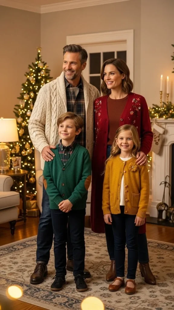 Cardigans help keep things comfortable and easy to coordinate. Mix red, cream, green, or brown without aiming for perfect matches. Add simple white tops underneath. This idea is great for last-minute photos because you can layer pieces you already own. A DIY option is to create small felt heart patches and attach them with double-sided tape for the shoot. Cardigans look great in sitting poses on sofas or rugs. Keep props small—like a mug or book.