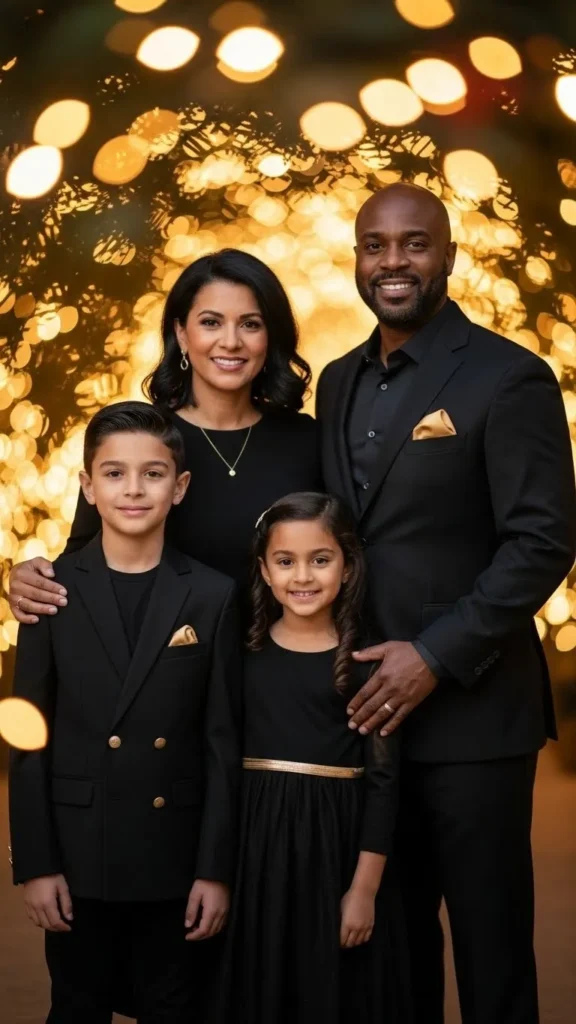 Black outfits with gold touches look festive without requiring fancy clothing. Use black tops, jeans, or dresses. Add gold through belts, jewelry, or hair clips. You can create gold accessories with metallic ribbon from gift-wrapping supplies. These outfits work beautifully against warm lights or darker backgrounds. Keep poses simple so the accents gently shine. This style works for dressy or casual photos.