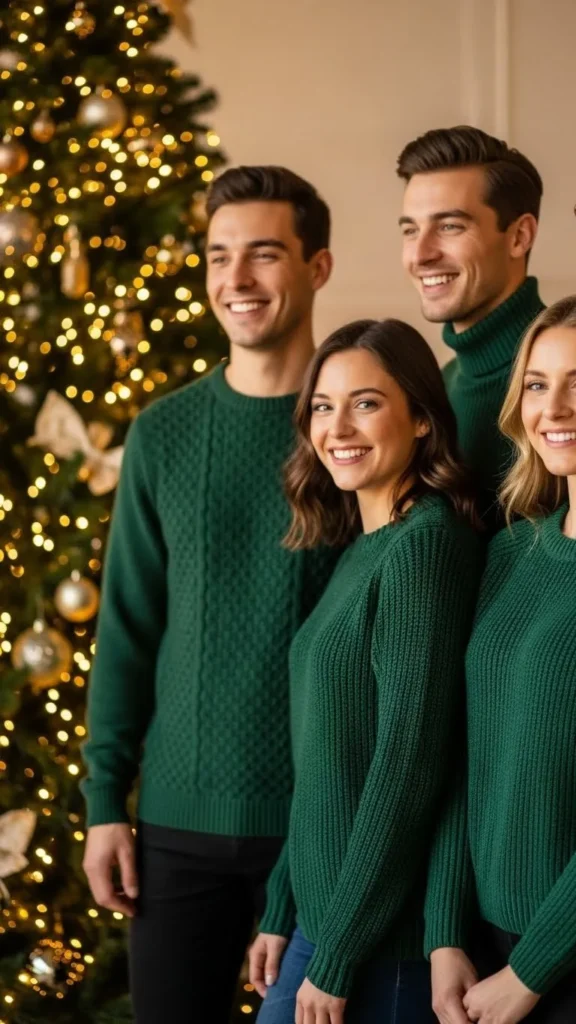 Evergreen sweaters look warm and soft in photos. The color blends nicely with holiday décor and works on all skin tones. You don’t need matching sweater styles—just keep the shade close. If buying new pieces feels heavy on the wallet, mix thrift-store finds and add small touches like matching buttons or tiny felt stars sewn near the hem. The texture of knit fabric photographs well because it adds depth without being loud. Pair your sweaters with denim or simple khaki bottoms for a clean look. If you want a DIY twist, create mini felt holly leaves and safety-pin them to each sweater before photos. It’s removable and kid-friendly. This look works indoors and outdoors, especially in natural light. Keep your poses simple—standing close or wrapping arms around each other—to let the color pull the whole outfit together.