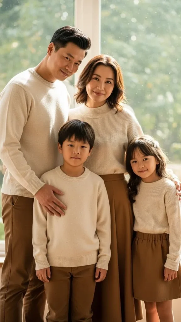 Cream and brown create a warm, simple palette. You can mix sweaters, vests, and scarves in cream tones. Brown pants or skirts add balance. These colors work well in both indoor and outdoor settings. To add a small DIY element, cut brown felt leaves and attach them lightly to sleeves for a gentle holiday nod. Keep your poses relaxed and natural. This outfit idea is easy to recreate using basics most families already own.