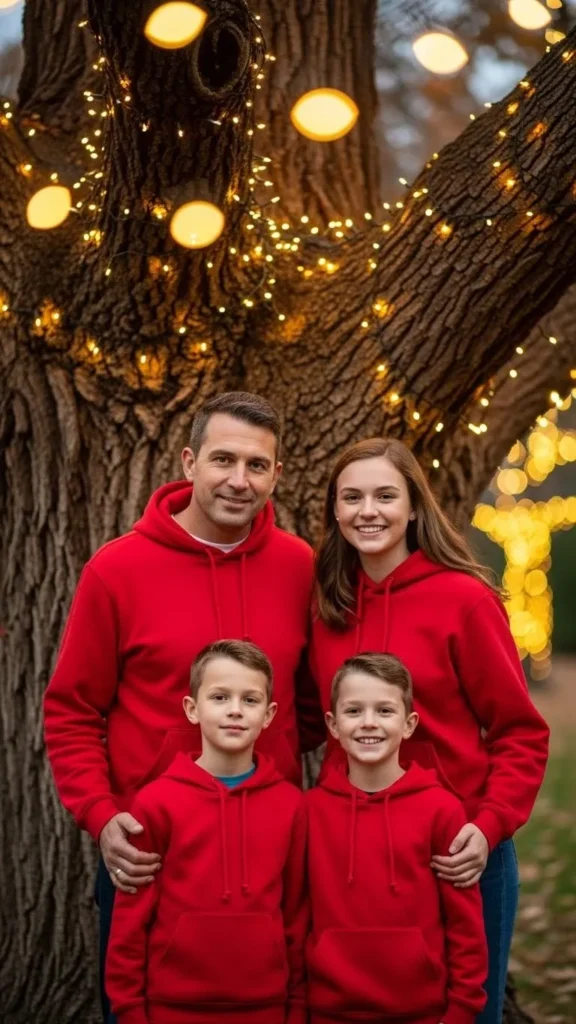 Red hoodies feel casual and cheerful. Most families already have red sweatshirts, making this a low-cost option. Add black or white bottoms for balance. If you want to create a shared detail, cut tiny felt circles to mimic ornaments and attach them to hood strings. You can also wear matching white sneakers for unity. Photos look great indoors or on a porch. Keep props simple so the hoodies shine.