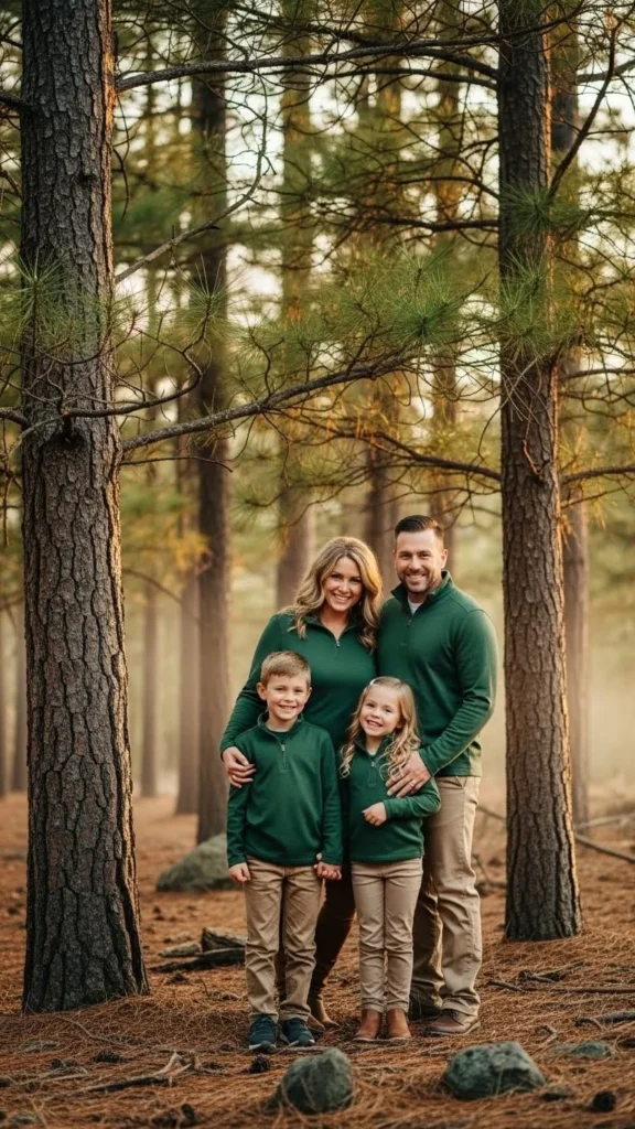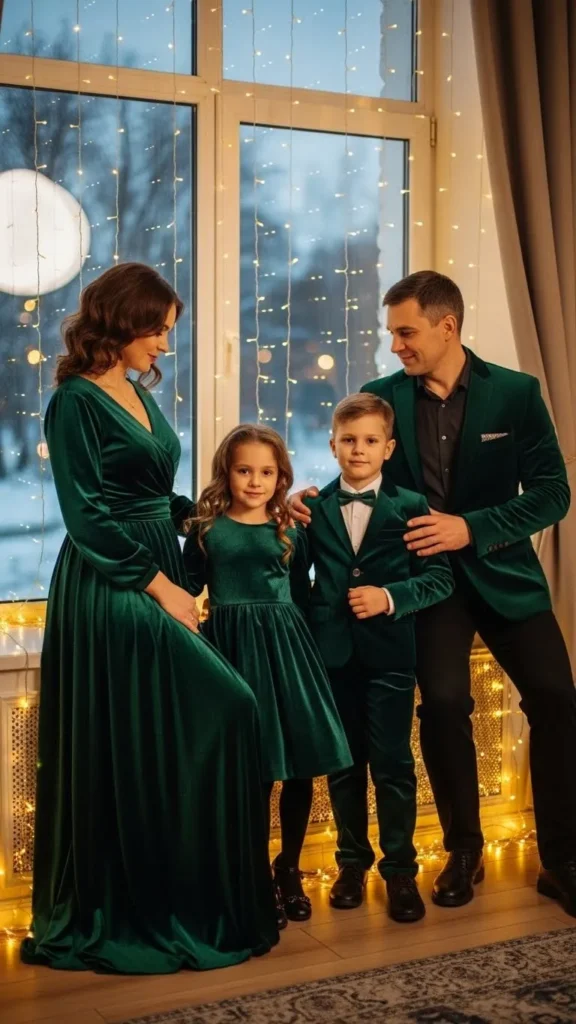 Velvet adds a soft shine that photographs well. Forest green looks rich without feeling too formal. You can mix dresses, shirts, and small accessories. Kids can wear velvet bows or headbands instead of full outfits. Velvet can be pricey, so check thrift stores for pre-loved pieces or choose velvet-like fabrics that mimic the look. Keep the setting warm—near a tree or window is perfect. If you want a short DIY touch, glue tiny pearl beads onto hair clips for a simple match across the family. Keep movements gentle since velvet reflects light differently from each angle.