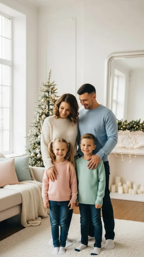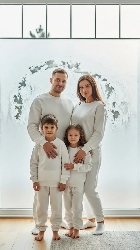 All-white outfits feel calm and easy. Sweatshirts and joggers are comfortable, especially for kids who dislike dressy clothes. Look for cotton blends so everyone feels relaxed. If pure white feels too bright, off-white or cream works the same in photos. Add small holiday touches like matching hairbands or simple red socks. You can also create DIY “snowflakes” using felt and attach them with removable tape for the photoshoot. White outfits reflect light well, making your skin tone glow naturally. A simple background—like a sofa or neutral wall—keeps the focus on faces. If someone worries about stains, pack spare tops or use washable markers to draw tiny stars before washing them off later. This look is calm, stress-free, and perfect for casual indoor pictures.