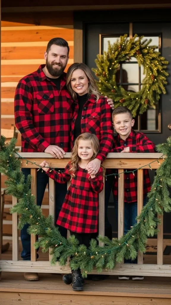 Buffalo check feels bold and festive. You can go full-pattern or pair one patterned piece with solid black bottoms for balance. These shirts are easy to reuse after Christmas too. To save money, buy one adult shirt and reuse the fabric to create small matching accessories for kids—like hair ties or small scarves. The pattern looks great in outdoor photos, especially near trees or on a wooden porch. Keep your poses simple so the strong pattern doesn’t overwhelm the shot. Add small neutral props like a plain blanket or basket.
