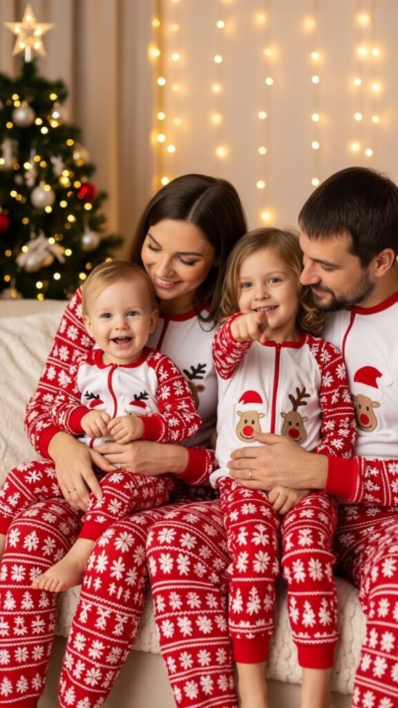 Onesies make photos fun, especially for kids. Choose reindeer, snowflake, or Santa styles. If matching patterns feel too bold, pick solid colors with small holiday prints. Onesies are usually soft, so kids stay happy during pictures. You can create small matching badges out of felt and attach them with safety pins to link everyone’s look. Onesies work best indoors on a sofa, bed, or by a tree. Keep props minimal—just a blanket or a pillow so the focus stays on faces.