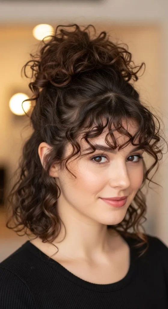 Gather all curls high and tie loosely. Let small pieces frame your face. Tease roots for height. This style is great for workouts and errands.