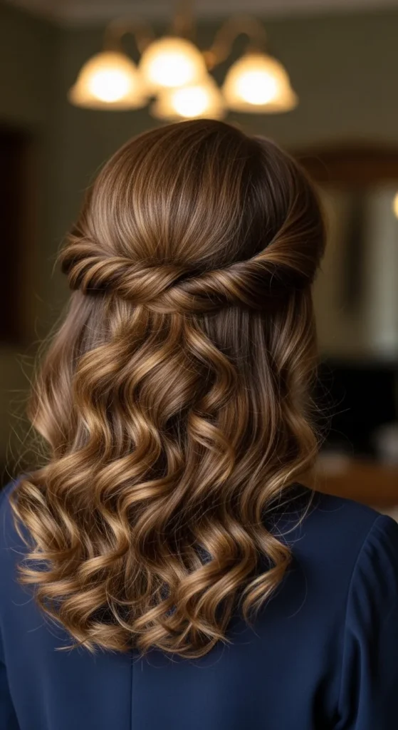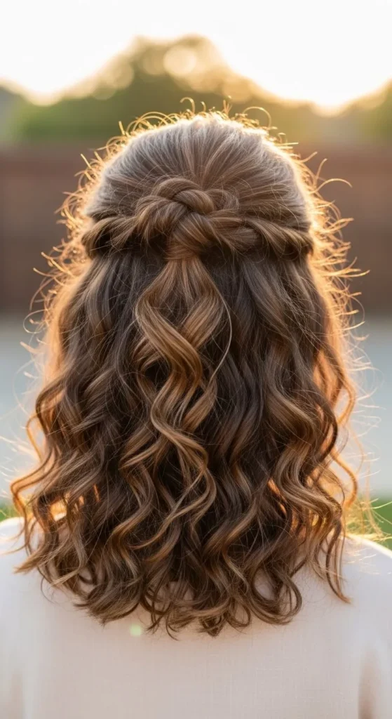 This half-up style is playful and flattering. Take sections from each side and twist them back. Secure with pins or a small elastic. Leave the rest of your curls loose. It works well for casual dates and family gatherings. Add a drop of oil for shine. DIY tip: Twist hair slightly while damp so it holds better without heat.