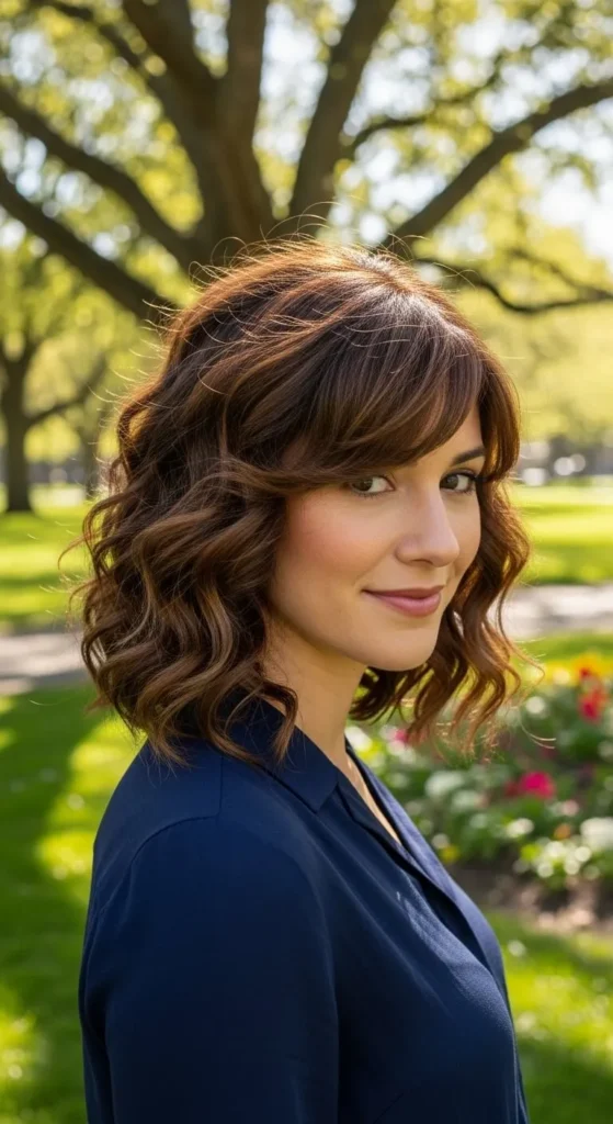Side-swept bangs soften your look. Style them with your fingers or a diffuser. Trim lightly at home between salon visits. Use light mousse for hold. This style fits both casual and semi-formal days.