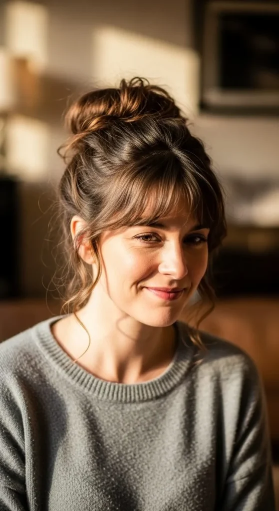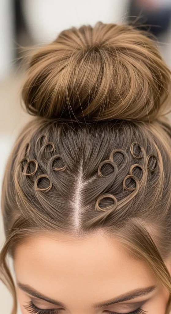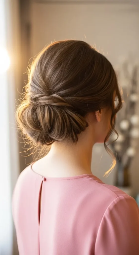 Twist hair into a rope and wrap it into a bun. Pin loosely. Pull sections for fullness. This style feels simple and elegant.