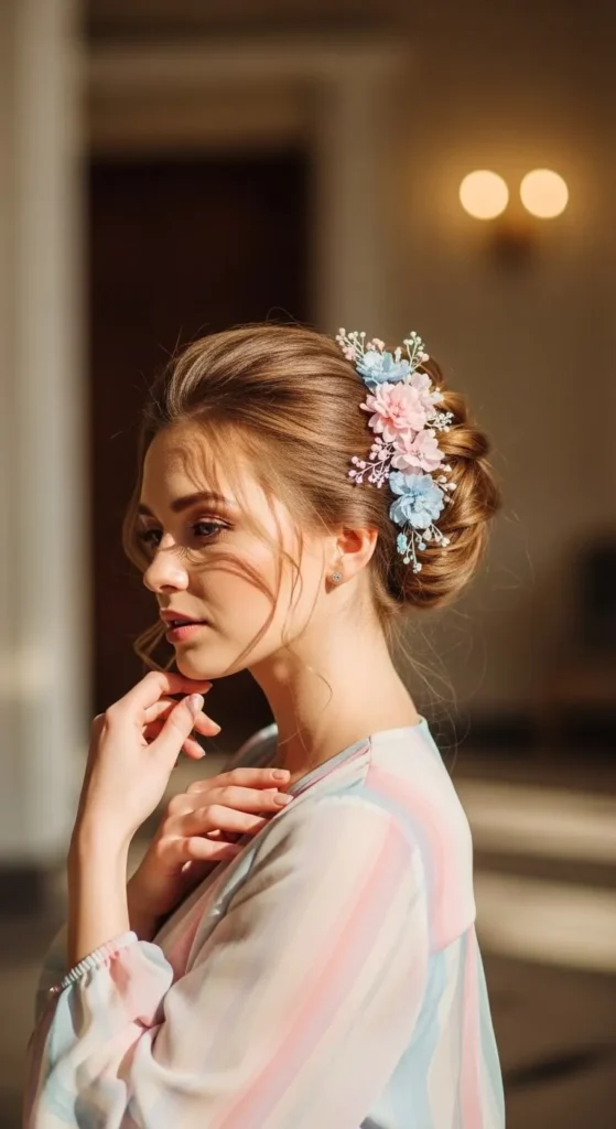 Make a low loose bun and add small floral pins. Reuse old clips. Curl front pieces with water and fingers. Avoid heavy sprays. This style fits family functions and special days.