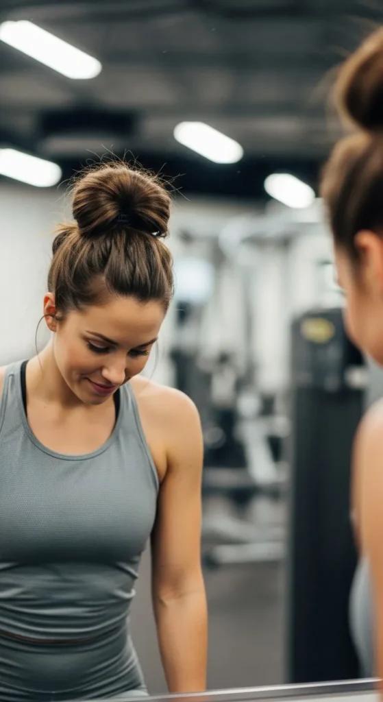 Gather hair high and secure firmly but not tightly. Use strong fabric bands. Apply light gel near roots. Carry extra bands. This bun stays in place during workouts.