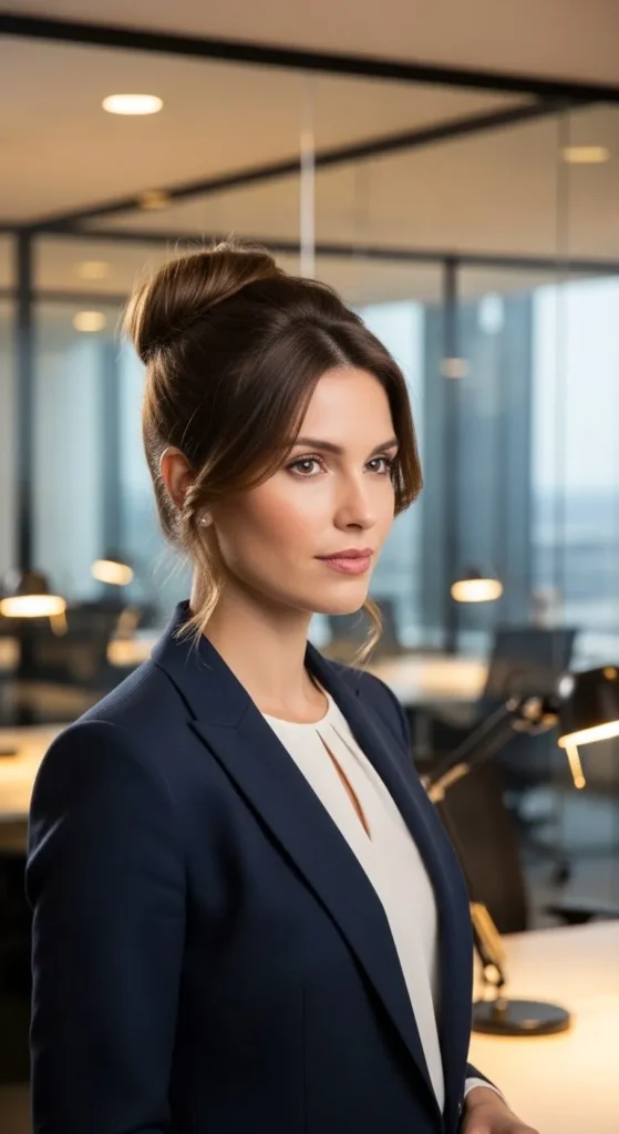Create a low bun and smooth the top with leave in cream. Pin loose curls neatly. Avoid big accessories. This style fits meetings and office life.