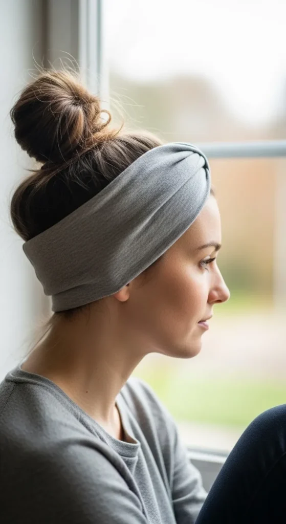 Place a fabric headband first. Then make a bun behind it. Choose cotton bands. Match colors with clothes. This helps control frizz.