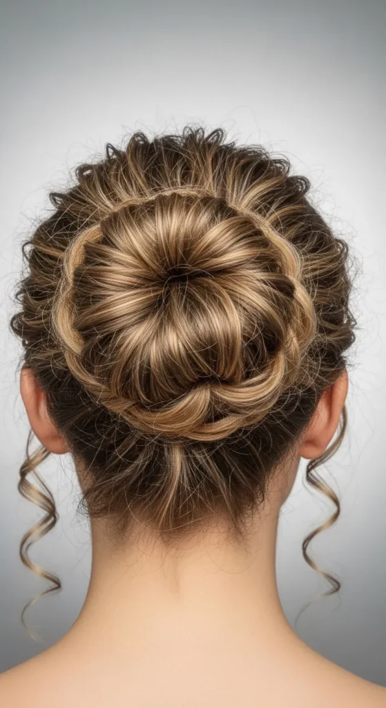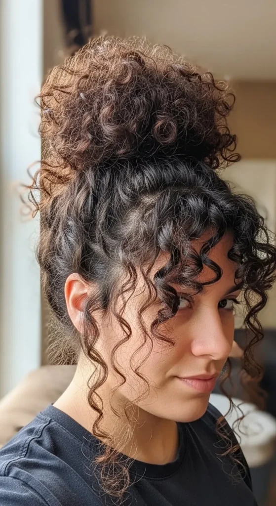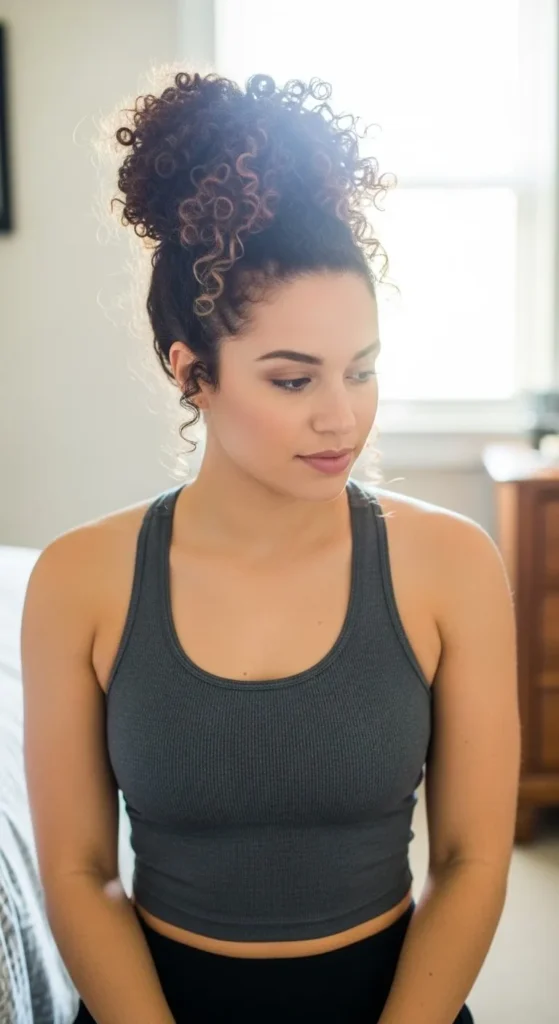 This bun is perfect for regular days when you want something quick and relaxed. Gather your curls loosely at the back of your head and twist them gently. Secure with a soft hair tie without pulling tight. Let small curls fall around your face for a natural feel. If your hair feels dry, rub a little conditioner or lotion between your palms and smooth it lightly over the bun. Old cotton scrunchies work well and save money. This style suits home days, shopping trips, and casual outings.