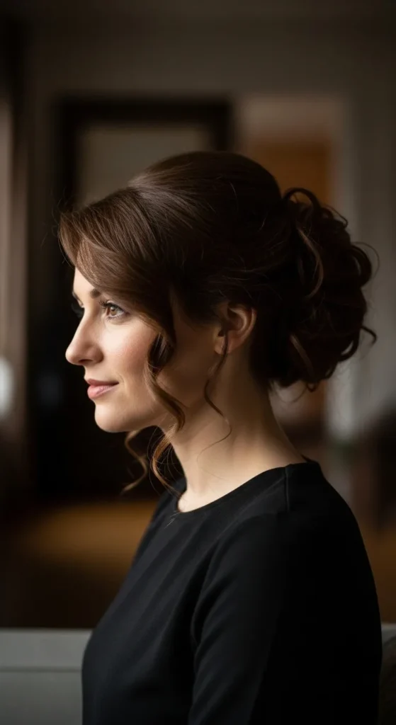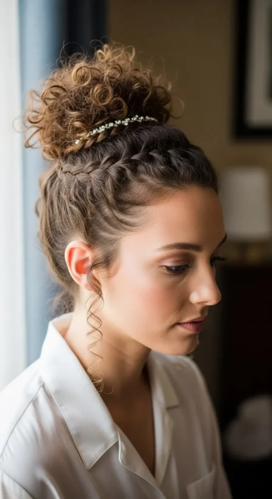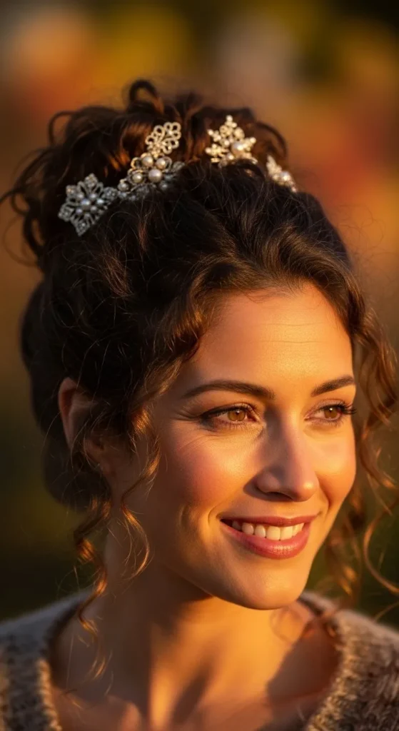 Brush curls to one side using fingers. Gather near your ear and twist into a bun. Leave some curls loose in front. Pin in a cross shape for support. Add a tiny drop of coconut oil for shine. This style feels romantic and soft.