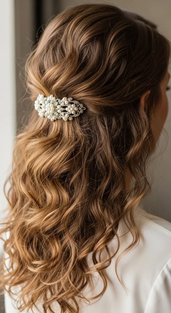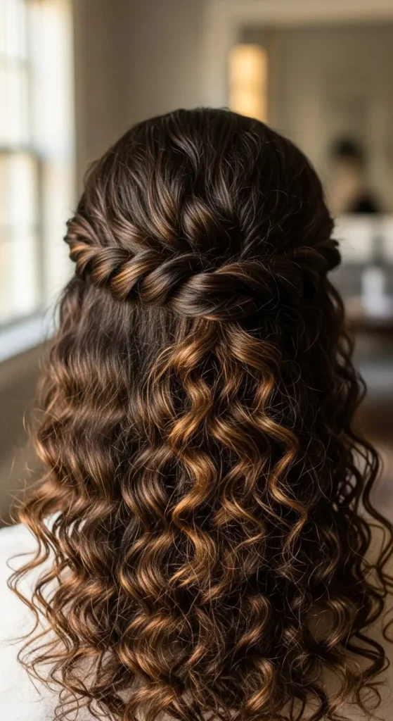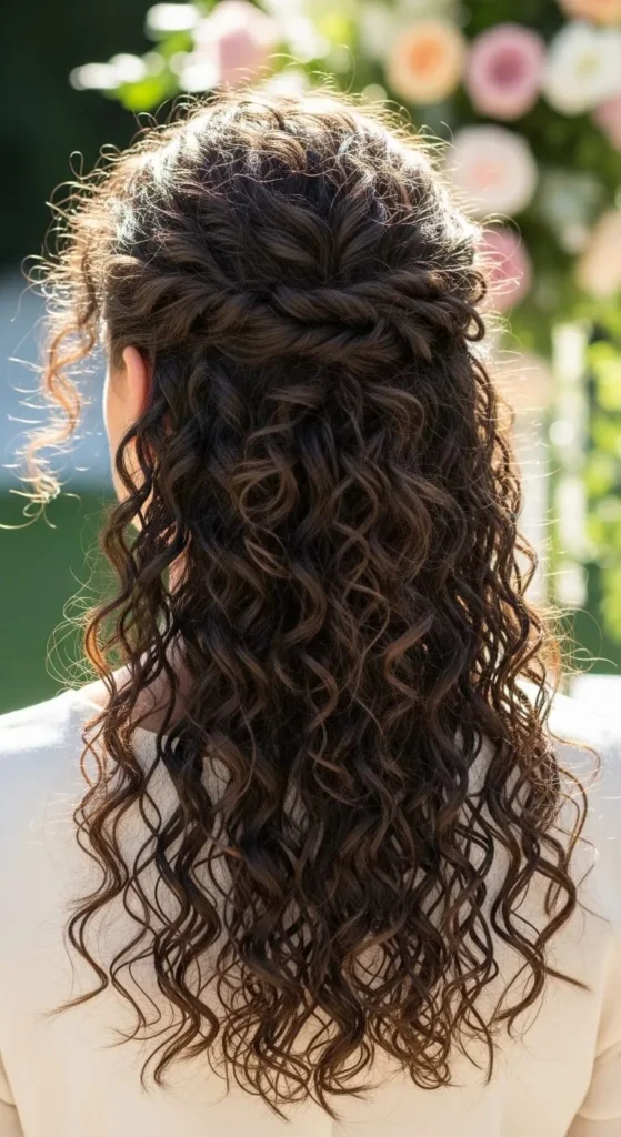 Half crown twists create a balanced, stylish look. Take front sections from both sides, twist, and secure at the back. Let the rest of your curls hang free. Works well for medium to long hair. Add small hair accessories if you want flair. Low-cost, easy to do at home, and adds a touch of elegance to natural curls.