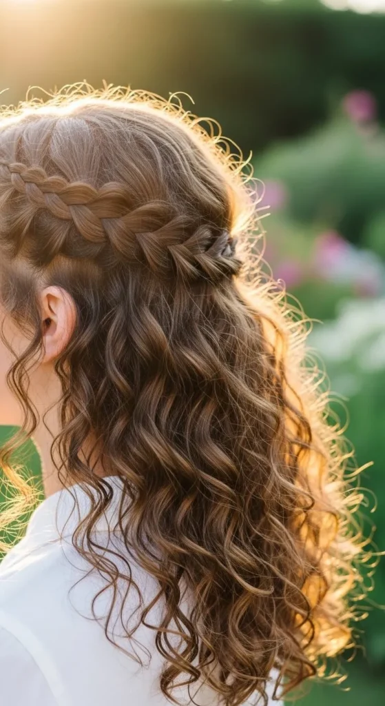 A twisted crown highlights your face elegantly. Twist sections along the hairline and secure with pins. The rest of the curls hang naturally. This style works for long curls and adds a soft, romantic touch. Use inexpensive pins or clips for decoration. Perfect for a date, brunch, or casual outing. Simple to achieve without expensive tools.