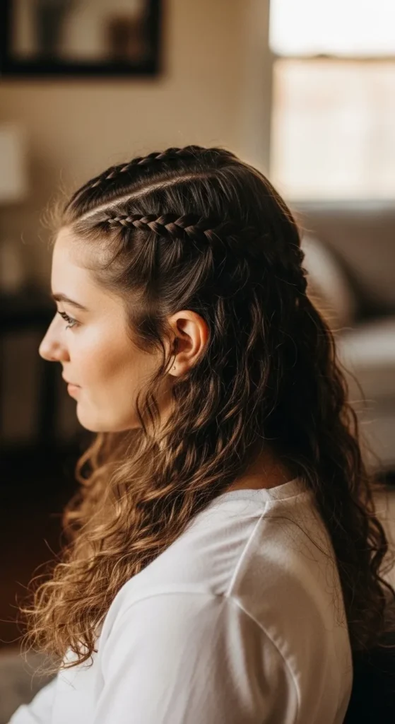 Two small braids add interest without altering your natural curls. Braid small front sections and secure with pins or elastics. The rest of your curls stay loose. Works for all lengths. Experiment with tiny beads or ribbons for flair. Simple, affordable, and fun, it’s a versatile DIY style.