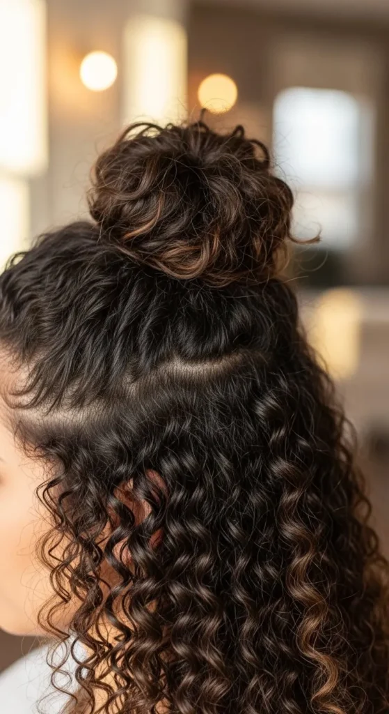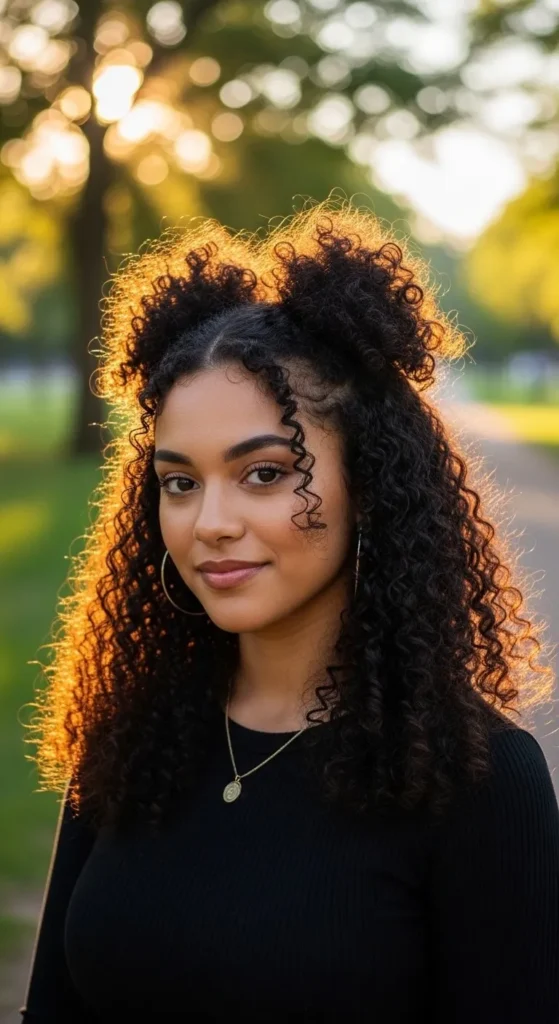 The half-up top knot keeps hair out of your face while showing off your curls. Gather the top half of your hair and twist it into a small bun. Secure it with a hair tie or clip. The remaining curls can flow freely. This style works for work, school, or casual outings. You can pull a few strands loose around your face for softness. For added volume, flip your head over and gently shake your curls before securing the bun. This is an easy DIY style that requires minimal tools and no extra products if your hair is naturally bouncy.