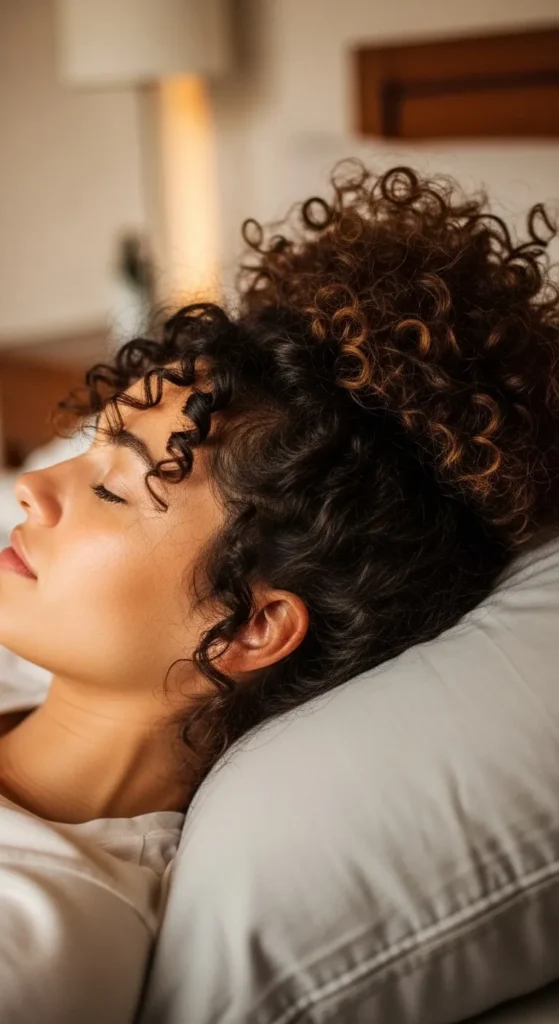 The pineapple updo preserves curls while sleeping and creates a fun daytime look too. Gather your hair at the crown and loosely secure with a soft scrunchie. Avoid tight elastics to prevent breakage. This style helps maintain curl definition overnight and reduces frizz in the morning. In the morning, release the hair, shake gently, and your curls stay springy. This method is free and keeps your hair healthy. For added flair, you can wrap a colorful scarf around the scrunchie for a playful touch.