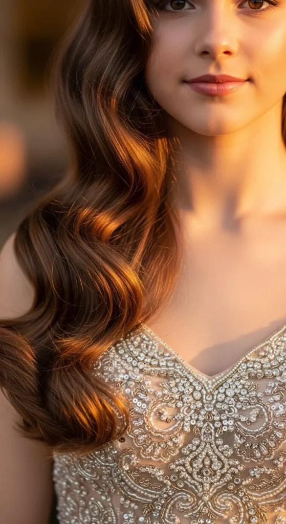 Old Hollywood never goes out of style. Big, bouncy waves bring that red-carpet charm to your prom look. Start with a curling iron and wrap wide sections of hair in the same direction. Let them cool, then gently brush through for soft, glossy movement. A light shine spray adds that mirror-like finish. For a quick fix, you can use Velcro rollers before makeup to save time. Complete with a sparkly clip on one side for a timeless feel that looks pricey — even if you did it at home.