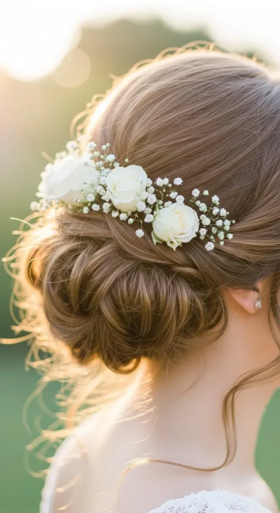If you love that boho-chic vibe, the braided crown is perfect. Start by curling your hair loosely. Take small side sections, braid each, and cross them over the back of your head like a headband. Secure them discreetly with pins. It’s easy to do yourself and pairs beautifully with flowy dresses. For extra sparkle, weave in mini hair gems or baby’s breath flowers — both look gorgeous and inexpensive to add.