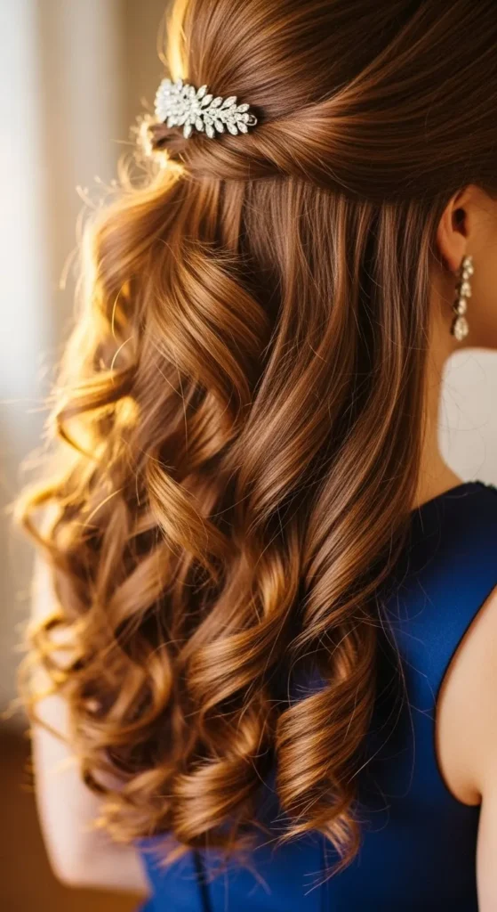 Twist two sections from the front and wrap them around the back to form a halo. Pin them neatly, leaving the rest of your hair down in waves. It’s romantic, angelic, and takes under ten minutes. Add soft curls and a mist of hairspray. This is perfect for minimalists who still want something graceful for prom.