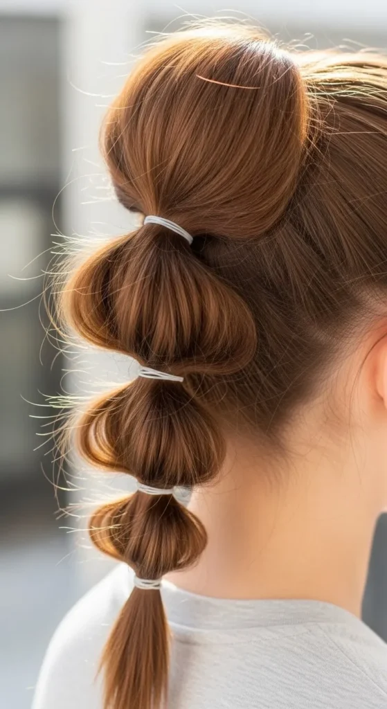 The bubble ponytail is trendy, easy, and surprisingly practical. Gather your hair into a mid or high ponytail. Add small elastics every few inches, then gently tug each section for that “bubble” effect. Use clear bands or ones that match your hair color. For a fun twist, wrap thin ribbons around each section. It’s great for thick hair and perfect for photos — playful yet stylish.