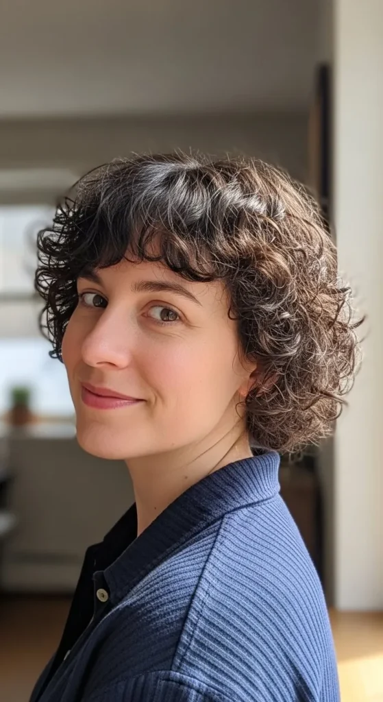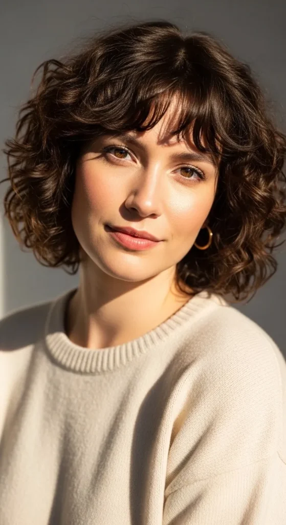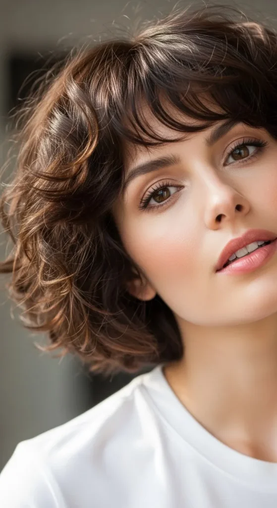 A curly shag uses uneven layers and soft bangs for natural movement. It feels relaxed and youthful. Use DIY salt spray and let curls dry freely. This cut grows well, making it budget-friendly and easy to maintain.