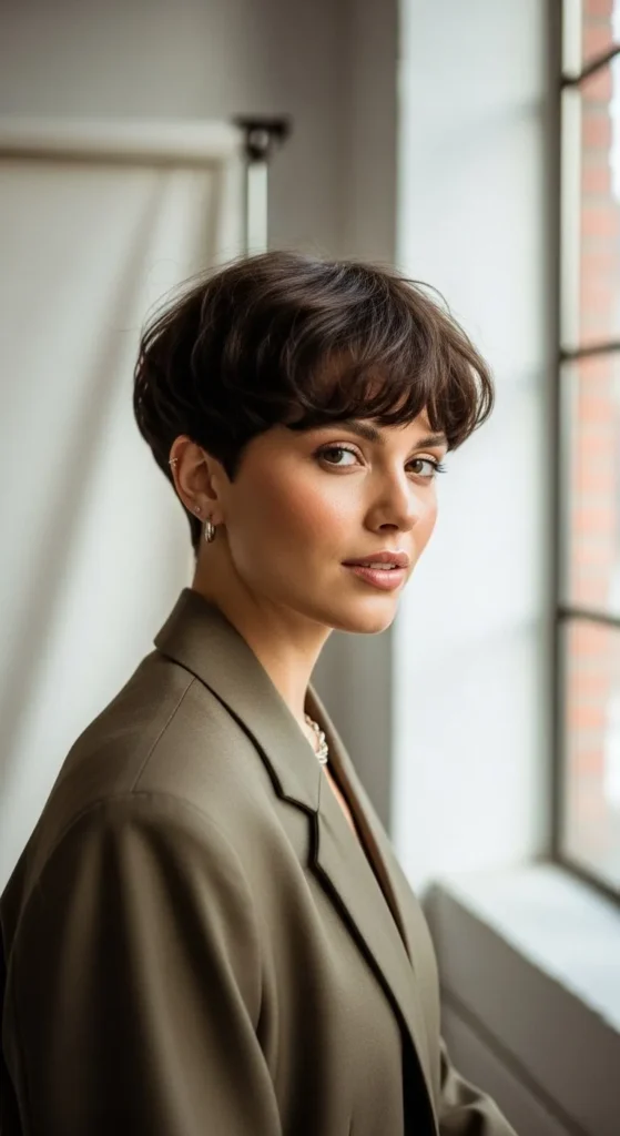 This pixie combines short sides with curly bangs for softness. Trim bangs carefully at home and use light gel to keep shape. It suits busy schedules.