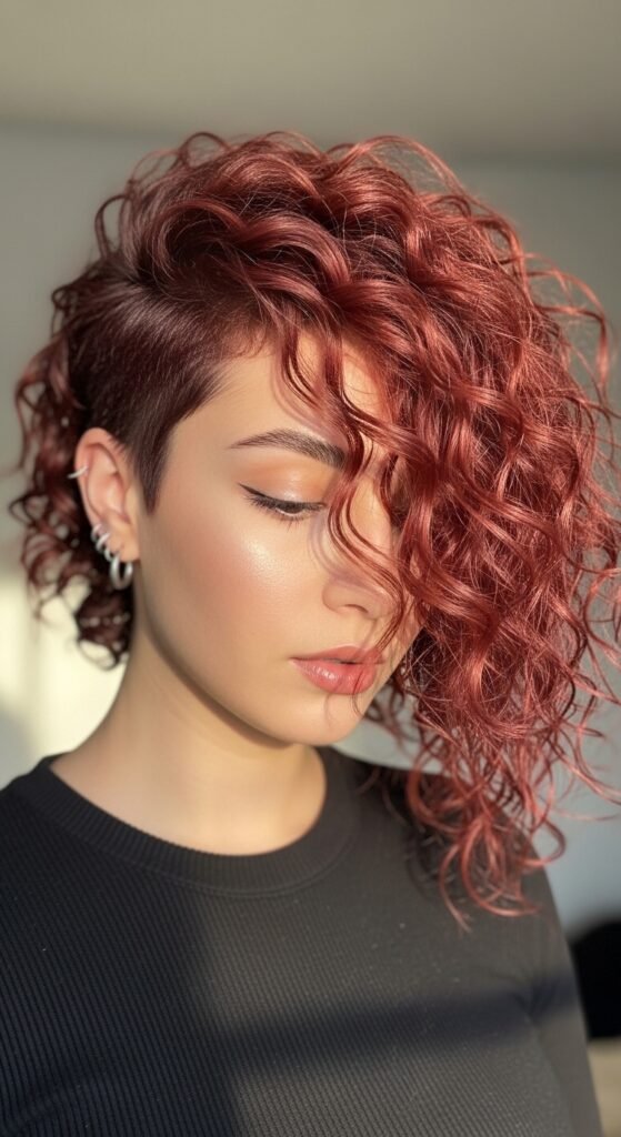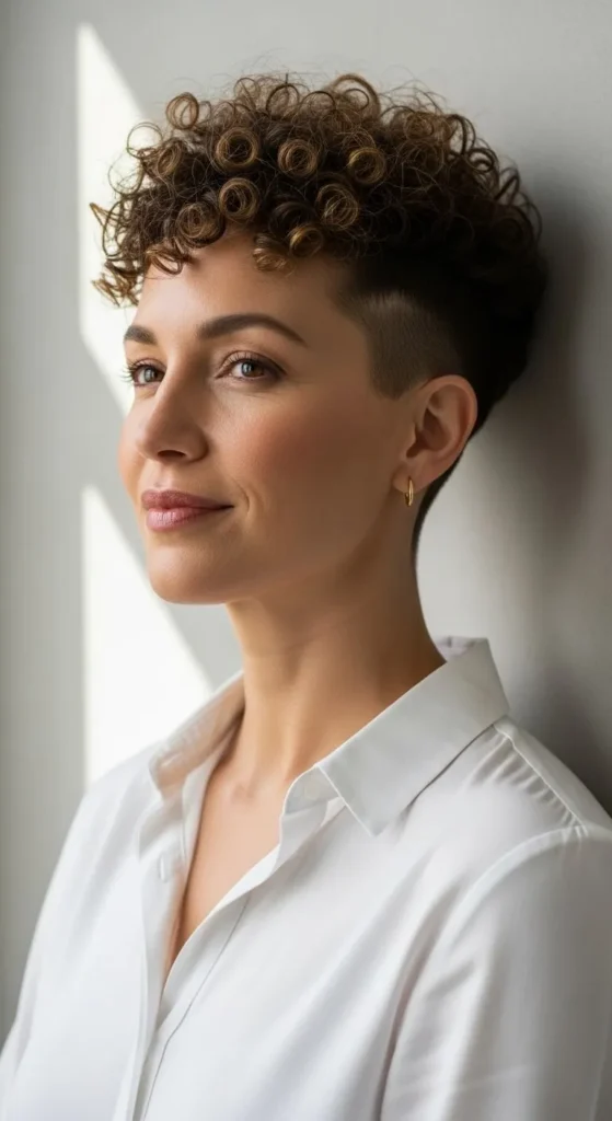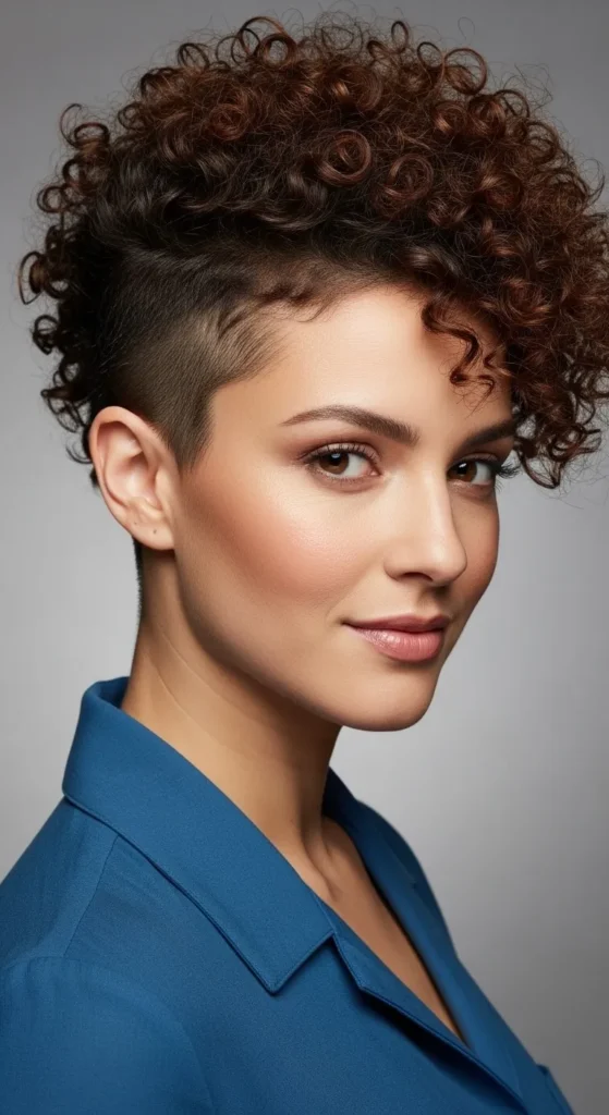A curly undercut removes bulk and highlights top curls. Maintain shaved areas at home and moisturize the scalp with light oil. This style reduces product use and styling time.