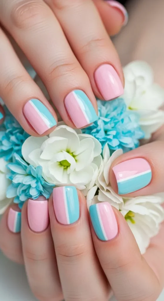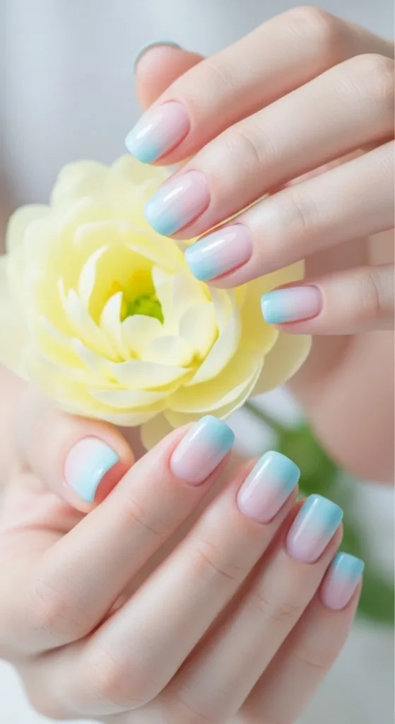 Blend two pastel shades on the tips. Start with a nude base. Dab the first color, then blend the second. A sponge helps. Short nails keep the gradient soft. Seal with clear polish. This style feels light and cheerful.